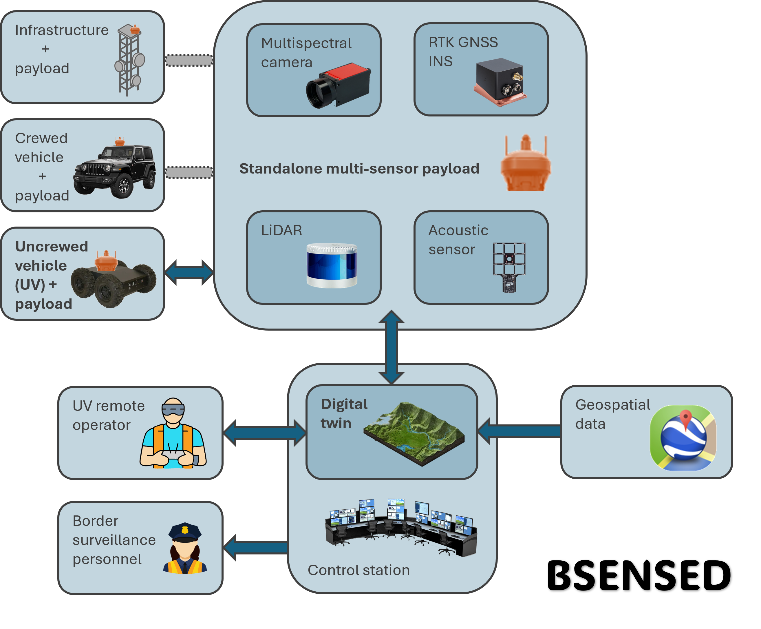 BSENSED proposes a framework for a digital twin from multi-sensor data for enhanced border surveillance and situational awareness. The digital twin foundation is geospatial data (e.g. Copernicus, Google Earth) complemented with multi-sensor data gathered from mapping equipment installed at surveillance towers or crewed and/or uncrewed vehicles. The BSENSED platform will allow updated mapping of the border area under surveillance, with immediate detection and localisation of people and vehicles, while also providing valuable assistance and training in complex terrain.